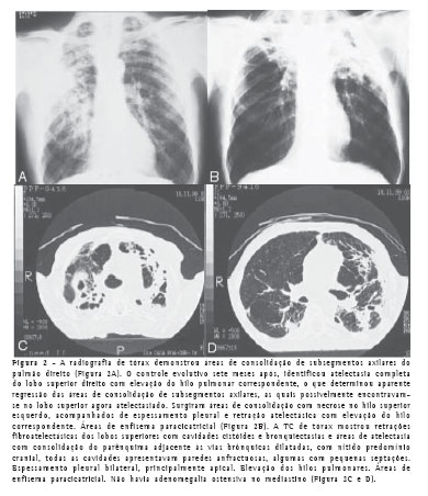Estudo imagético: o radiograma de tórax apre-sentava lesões fibronodulares, componente atelec-tásico e espessamento pleural apical à direita.