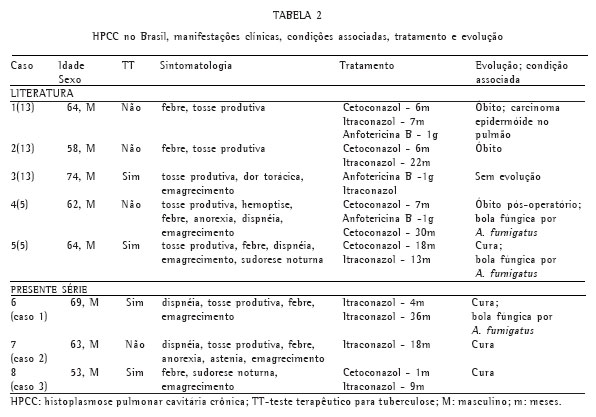Têm sido descritos casos de histoplasmose associados ou seguidos por bola fúngica, de tratamento eminentemente cirúrgico.(18) Na maioria dos casos de HPC cavitária, a função pulmonar já está comprometida e não há planos de clivagem cirúrgica devido às bolhas de enfisema e à fibrose. A cirurgia pode acelerar o surgimento de insuficiência pulmonar franca e o óbito.(4) O itraconazol é uma alternativa de tratamento.(19) Dos casos brasileiros, três tiveram diagnóstico de bola fúngica (Tabela 2), sendo que em dois a colonização fúngica surgiu em vigência de histoplasmose ativa. A cirurgia foi realizada somente em um e levou a óbito.(5)