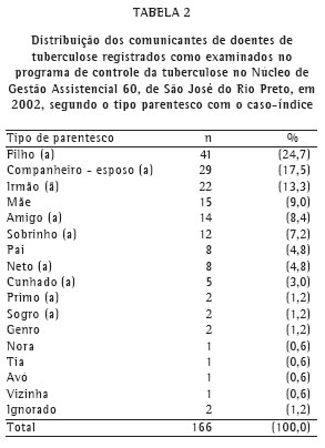 Na Tabela 2 apresentam-se os tipos de parentesco dos comunicantes com o caso-índice de tuberculose. Entre os comunicantes examinados, 41 eram filhos (as) (24,7%), 29 companheiros (as) (17,5%), 22 irmãos