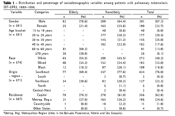 DiscussionIn the present study, gender distribution differed between the elderly and nonelderly groups. Among the nonelderly patients, the proportions of males and females (64.4% and 35.6%, respectively) followed the pattern of the pulmonary tuberculosis population treated at all Municipal Health Centers, as estimated by the Municipal Secretary of Health.