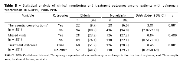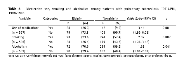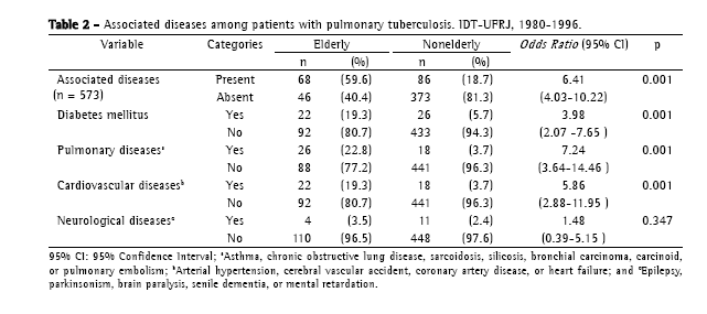 (15-49 anos) portadores de tuberculose pulmonar atendidos no Instituto de Doenças do Tórax da Universidade Federal do Rio de Janeiro no período de 1980 a 1996. Resultados: No grupo de idosos, houve associação entre diabetes mellitus (OR = 3,98; IC95% = 2,07-7,65; p = 0,001), doenças pulmonares (OR = 7,24; IC95% = 3,64-14,46; p = 0,001) e cardiovasculares (OR = 5,86; IC95% = 2.88-11.95; p = 0,001). O tabagismo (OR = 2,07; IC95% = 1,26-3,42; p = 0,002) e o etilismo (OR = 1,63; IC95% = 1,01-2,68; p = 0,041) também foram mais freqüentes neste grupo. O tratamento levou a freqüentes reações adversas nos idosos (OR = 1,62; IC95% = 1,04-2,54; p = 0,024), principalmente de origem gastrintestinal (OR = 1,64; IC95% = 1,01-2,77; p = 0,047), e sua eficácia foi menor neste grupo: apenas 51% de cura e 24% de óbitos. O abandono do tratamento foi elevado nos dois grupos, em torno de 23%. Conclusões: As reações adversas e o resultado do tratamento foram piores nos idosos, com maior freqüência de complicações e letalidade, devido a uma maior toxicidade farmacológica e a uma maior prevalência de doenças associadas neste grupo etário.