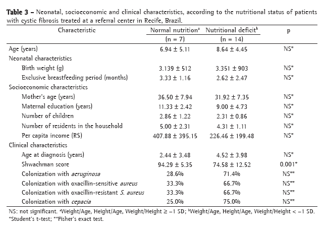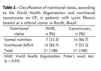 The Shwachman score (SS) evaluates the clinical severity of the patients with CF using clinical criteria of nutrition, general activity, physical examination and radiographic findings. The score was evaluated by three physicians according to the criteria recommended by the original author,(25) and a mean of the values found was calculated. Patients with mean scores > 70 were classified as good/excellent, whereas those with mean scores from 41 to 70 were classified as moderate/fair, and those with mean scores < 40 were classified as severe.