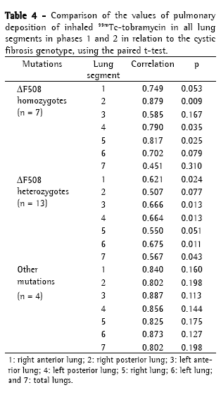 The objective of this study was to evaluate the pulmonary deposition of inhaled tobramycin in CF patients colonized with P. aeruginosa. To that end, we used lung scintigraphy, comparing the penetration of this radioactive drug prior to and after the use of bronchial clearance measures, with the use of respiratory therapy and inhaled albuterol, as well as reporting these data with a severity and mutation score.
