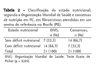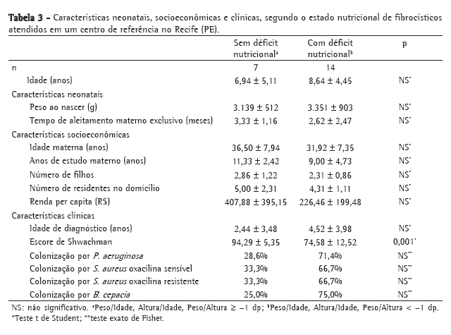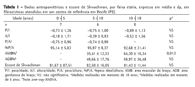 O escore de Shwachman (ES) avalia a gravidade clínica dos pacientes com FC utilizando critérios clínicos de nutrição, atividade geral, exame físico e achados de radiografia. Este escore foi avaliado por três médicos seguindo os critérios recomendados pelo autor original,(25) e uma média dos valores encontrados foi calculada, sendo classificados como excelente/bom aqueles pacientes que atingiram uma pontuação maior que 70, como moderado/regular aqueles com pontuação entre 41 e 70, e como grave aqueles com menos de 40 pontos.