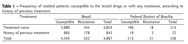 In the Federal District of Brasília, 214 patients (90.7%) were treatment-naïve, whereas 22 (9.3%) reported a history of previous treatment. In the other parts of Brazil, these values were 4,024 (82.7%) and 843 (17.3%), respectively. The frequency of cases with or without resistance to any drugs is shown in Table 1.
