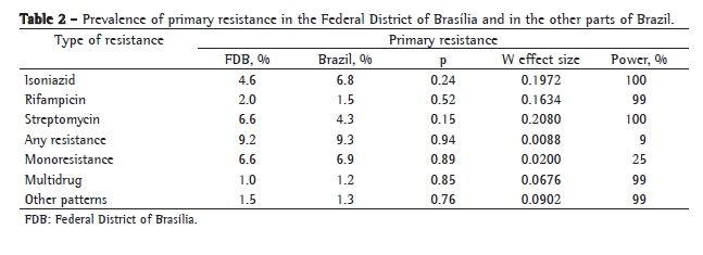 As observed in Tables 2 and 3, there was no statistically significant difference between the prevalences, regardless of the patterns, between primary and acquired resistance in the Federal District of Brasília and in the other parts of Brazil. In two analyzed situations, the "any resistance" or "monoresistance" patterns for the primary type, the prevalences showed virtually identical, translating into a minimal size difference and implying a reduced power. In the Federal District of Brasília, no resistance to EMB was observed, nor was there resistance to PZA and ETH, in accordance with reports for the other parts of Brazil.
