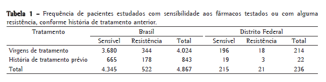 No Distrito Federal, 214 pacientes (90,7%) eram virgens de tratamento, enquanto 22 (9,3%) referiam antecedente de tratamento prévio. No restante do Brasil, esses valores foram 4.024 (82,7%) e 843 (17,3%), respectivamente. A frequência de casos com e sem resistência a quaisquer fármacos pode ser vista na Tabela 1.