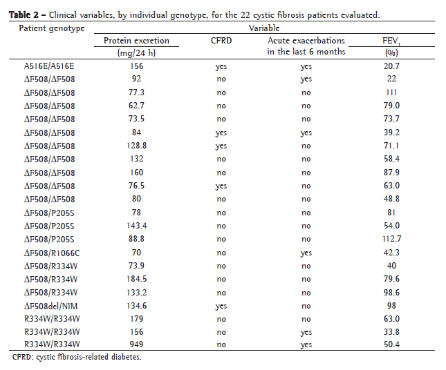 In the present study, the patients with the ΔF508 mutation presented lower protein excretion than did those with the R334W mutation (p < 0.05).