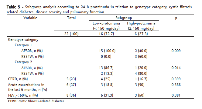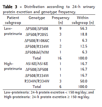 Protein excretion was normal in 90% of the patients who were homozygous for ΔF508 and in 100% of those with the ΔF508/P205S genotype. In the category 1 analysis, 66.7% of the patients with the ΔF508/R334W genotype also presented protein excretion < 150 mg/dL.