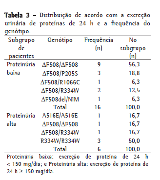 Todos os pacientes que eram homozigotos R334W/R334W estavam no subgrupo proteinúria alta. No subgrupo proteinúria baixa, 9 pacientes eram homozigotos ΔF508/ΔF508 (56,3% no subgrupo). Houve apenas um homozigoto ΔF508/ΔF508 no subgrupo proteinúria alta.
