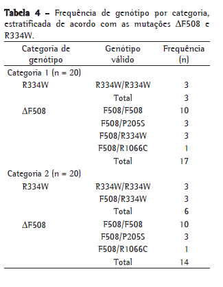Para avaliar a correlação entre o genótipo e a excreção de proteínas, foram avaliadas as duas principais mutações do gene CFTR (ΔF508 e R334W). Devido à existência do genótipo ΔF508/R334W, duas categorias foram criadas para garantir uma análise estatística acurada: a categoria 1, na qual o genótipo ΔF508 foi avaliado, e a categoria 2, na qual o genótipo R334W foi avaliado.