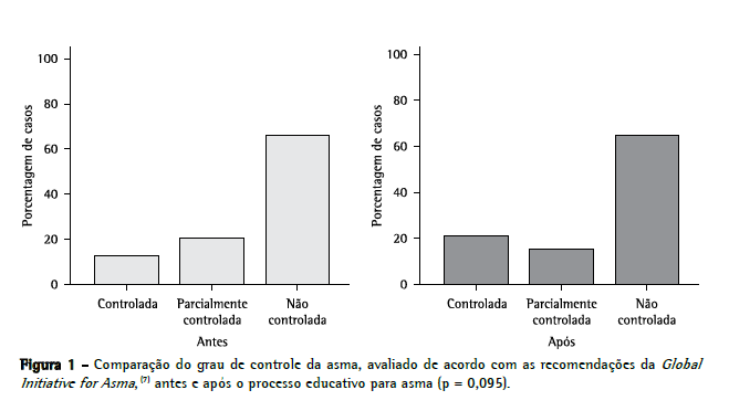O fato de não termos obtido um impacto sobre o grau de controle da doença poderia ser atribuído à persistência de uma percentagem de pacientes não aderentes ao uso das medicações de manutenção, à persistência de erros na técnica inalatória ou mesmo a dificuldades na obtenção das medicações. Neste estudo, para avaliar o grau de controle da doença, foram utilizados os critérios propostos pelas diretrizes da GINA. (7) Essa medida, mesmo não sendo validada na literatura, agrega vários marcadores clinicamente importantes sobre o controle da asma. (30) Por outro lado, o intervalo de 3 meses entre a intervenção e a reavaliação foi suficiente para que o processo educativo tivesse tido um impacto sobre o grau de controle da doença.