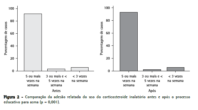A Figura 2 mostra a comparação da adesão relatada do uso de corticosteroide inalatório antes e após o processo educativo. Houve uma diferença significativa (p = 0,001), sendo que a percentagem de pacientes que relataram utilizar a medicação em 5 ou mais dias na semana aumentou de 88,7% para 91,3%, enquanto a percentagem de pacientes que relataram utilizar a medicação entre 3 ou mais dias na semana mas menos de 5 dias reduziu de 3,5% para 1,7%, e a percentagem de pacientes que relataram usar a medicação menos de 3 dias na semana não modificou significativamente (7,8% vs. 7,0%).