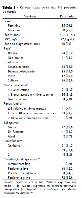 A Tabela 1 mostra as características gerais dos pacientes estudados. Houve predomínio do sexo feminino (73,9%). A média de idade foi de 51 anos, e a mediana da idade ao diagnóstico de asma foi de 30 anos. A maioria era da raça branca (81,7%), casado ou com parceiro fixo (53,9%), com baixo nível educacional (61,7% tinham tempo de estudo ≤ 8 anos) e com baixa renda familiar (70,4% das famílias percebiam < 3 salários mínimos mensais). Quanto à história tabágica, 62,6% nunca haviam fumado, 35,7% eram ex-fumantes, e apenas 1,7% eram fumantes ativos. Dos 115 pacientes, 72 (62,6%) foram classificados como tendo asma persistente grave; 28 (24,3%), como tendo asma persistente moderada; 14 (12,2%), como tendo asma persistente leve; e 1 (0,9%), como tendo asma intermitente leve.