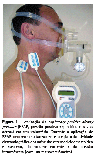 O sinal eletromiográfico foi inicialmente obtido com o indivíduo em respiração espontânea (pré-EPAP), sentado e em repouso, com a região cervical e membros superiores em posição neutra. O indivíduo foi orientado a não realizar qualquer movimento com esses segmentos durante a captação do sinal.