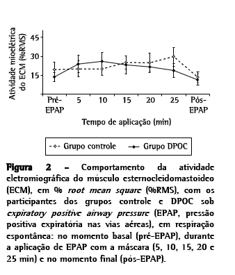 Em conclusão, nosso estudo demonstrou que a aplicação de 15 cmH2O de EPAP por máscara facial promoveu, após sua retirada, uma redução da atividade eletromiográfica do ECM, tanto em indivíduos saudáveis, quanto em portadores de DPOC, o que não foi observado em relação ao músculo escaleno. Esse benefício deve ser considerado quando essa modalidade pressórica é indicada a pacientes com DPOC, pois nesses encontra-se normalmente um aumento da atividade da musculatura