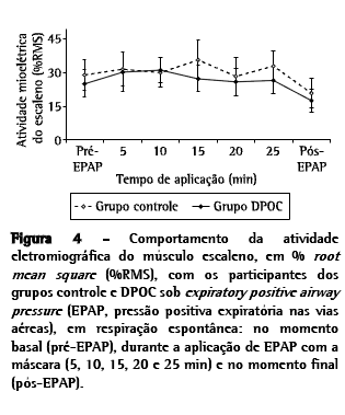 Ao contrário do que se esperava, a atividade eletromiográfica do escaleno não evidenciou alterações significativas com o uso da EPAP, apesar de ter apresentado um aparente aumento durante a sua aplicação e uma tendência a redução após sua retirada. Esse achado vai ao encontro do resultado de um estudo, no qual, objetivando avaliar o comportamento do músculo escaleno em indivíduos hígidos sob o uso da PEEP de 5-15 cmH2O, demonstrou-se que, durante a aplicação dos dois níveis pressóricos, houve um aumento da atividade fásica muscular respiratória e que, após a retirada do suporte pressórico, os níveis de atividade eletromiográfica retornaram à condição de antes da intervenção.(28) Os autores do estudo consideraram que o aumento do trabalho muscular inspiratório ocorreu devido à imposição de um gradiente de pressão na fase expiratória, o que demandou maior trabalho muscular inspiratório na tentativa de minimizar a diferença pressórica entre as fases inspiratória e expiratória.(28)