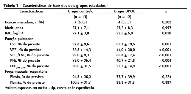 A amostra foi composta por 25 participantes, sendo 13 indivíduos hígidos (grupo controle) e 12 portadores de DPOC (grupo DPOC), havendo distribuição homogênea quanto ao gênero, média de idade e força muscular respiratória, representada por PImáx e PEmáx, dos indivíduos alocados. Houve diferenças entre os grupos quanto ao IMC (grupo controle com sobrepeso) e à função pulmonar (redução de todas as variáveis analisadas no grupo DPOC, evidenciando as perdas causadas pela doença; Tabela 1). A força muscular respiratória não foi estatisticamente diferente entre os grupos, indicando uma possível habilidade do grupo DPOC em manter as pressões promovidas pelos músculos inspiratórios e expiratórios. Apesar da falta de significância estatística, que se deveu provavelmente ao tamanho da amostra, é importante ressaltar que o grupo DPOC apresentou uma redução importante da PImáx (Tabela 1).
