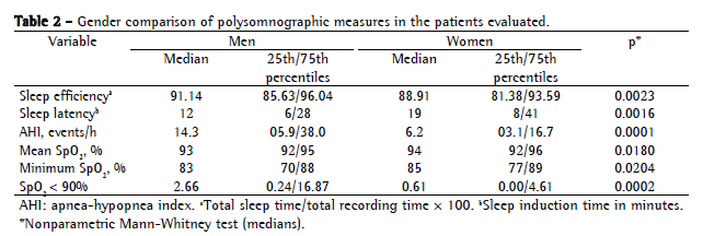 The prevalence of sleep apnea in the study population was 71.2%, sleep apnea being classified as mild in 30.7% of the cases, as moderate in 10.0%, and as severe in 22.6%. Apnea was more common among men than among women (81.2% vs. 56.8%; p < 0.001), as were severe cases (30.4% vs. 11.4%). The median AHI was significantly higher for men than for women (14.3 events/h vs. 6.2 events/h; p < 0.0001; Table 2).