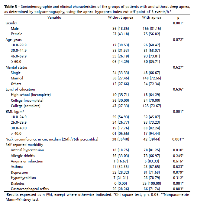 This was a cross-sectional observational study. The study population comprised 323 consecutive patients referred, by physicians working within the private health care system in Brazil, to a sleep laboratory for polysomnography between December of 2006 and March of 2007. In all cases, the reason for the referral was clinical suspicion of having sleep disorders (snoring, sleep apnea, insomnia, excessive daytime sleepiness, and periodic leg movements in sleep).