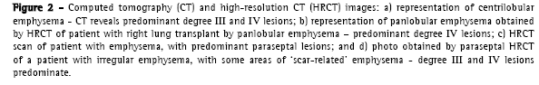 In 1958,(13)a very important article waspublished, which pointed out errors in the preparation of pulmonary specimens in order to understand emphysematous lesions, describing better distention and fixation techniques. In a review of previous studies,(6) one author thus defined anatomopathological parameters, according to their distribution in relation to the lobes, (Figure 2): centrilobular, paraseptal or perilobular, panlobular and irregular.