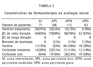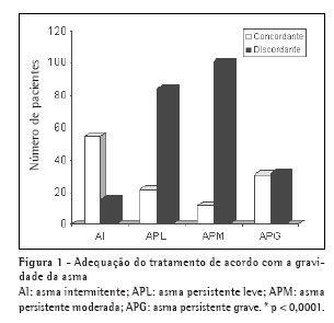 O tratamento foi então classificado em concordante ou discordante, de acordo com o proposto pelo III Consenso Brasileiro de Asma:(20) asma intermitente - uso de apenas b2-agonista de curta duração; asma persistente leve - uso de corticóide inalatório em dose baixa (400 mg/dia de beclometasona ou equivalente) ou antileucotrieno; asma persistente moderada - uso de corticóide inalatório em dose baixa ou média (400 a 800 mg/dia de beclometasona ou equivalente) associado a b2-agonista de longa duração ou corticóide inalatório em dose alta (> 800 mg/dia de beclometasona ou equivalente); asma persistente grave - uso de corticóide inalatório em dose alta, b2-agonista de longa duração, corticóide oral, teofilina ou antileucotrienos.