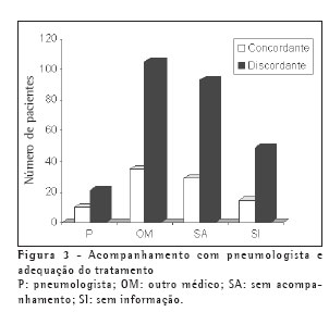 Houve uma pequena tendência, sem significância estatística, de haver maior número de tratamentos discordantes do Consenso nos pacientes previamente tratados por não pneumologistas (Figura 3). O tratamento foi considerado discordante em 21/31 pacientes em tratamento com pneumologista (68%), 105/140 por qualquer outro médico (75%) e 93/122 sem acompanhamento (76%). Em 64 pacientes não foi possível caracterizar esta informação através do prontuário.
