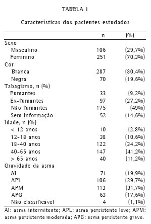 Foram analisadas as informações provenientes do prontuário médico de 357 pacientes (Tabela 1), 106 homens (29,7%) e 251 mulheres (70,3%), 287 brancos (80,4%) e 70 não brancos (19,6%), 33 tabagistas (9,2%) e 97 ex-tabagistas (27,2%), com idades entre onze e 80 anos (média de 41 ± 18 anos). Foram excluídos da análise 4 pacientes por falta de dados no prontuário.