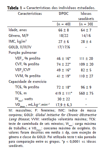 ResultadosOs grupos foram pareados quanto à distribuição de gênero e não apresentaram diferenças estatísticas quanto à idade e ao IMC. Além da obstrução ao fluxo aéreo e da redução da capacidade de exercício mostradas na Tabela 1, os portadores de DPOC apresentaram escore na escala MRC de 3 ± 1 pontos, índice BODE de 4 ± 2 e histórico de tabagismo de 38 ± 35 anos-maço. A Tabela 1 mostra também que os idosos saudáveis apresentaram valores normais de função pulmonar e de capacidade de exercício.