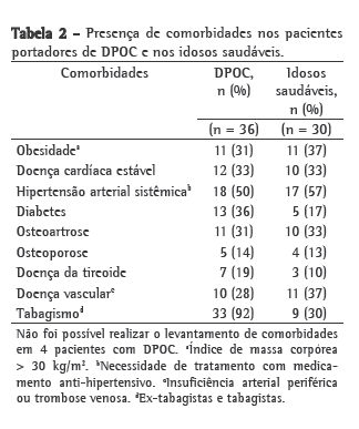 Todos os pacientes portadores de DPOC eram aposentados, e 13 deles (32,5%) trabalhavam em atividades informais. Atividade informal foi considerada como qualquer atividade profissional ocasional e sem vínculo empregatício (poucos dias por semana, poucas horas por dia). No grupo controle, 27 indivíduos (90%) eram aposentados e desses, 10 trabalhavam em atividades informais.