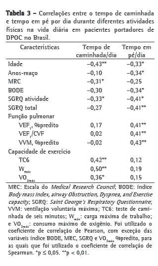 Os resultados do presente estudo também revelaram uma correlação positiva entre o tempo de caminhada por dia, a distância percorrida no TC6 e a carga máxima de trabalho no teste cardiopulmonar de esforço em pacientes com DPOC. A existência de correlação entre o nível de atividade física na vida diária e a capacidade funcional de exercício já foi mostrada previamente, variando entre 0,46 e 0,74 em diferentes estudos.(3,6,30) No presente estudo, a correlação entre a atividade física na vida diária e o TC6 em pacientes no Brasil foi menor (r = 0.42), assim como a relação da atividade física na vida diária com a capacidade máxima de exercício (r = 0.41) foi menor do que no estudo com pacientes belgas (r = 0,64).(3) Resultados prévios mostraram também que, em pacientes europeus, a distância percorrida no TC6 foi o principal fator determinante do tempo de caminhada por dia na vida diária em pacientes com DPOC (r2 = 0,56; p < 0,0001), e os pacientes que caminharam menos de 400 m no TC6 foram aqueles considerados extremamente inativos em sua vida diária.(3) Tal fato não foi observado nos pacientes no Brasil, visto que não foi identificado um valor no TC6 que pudesse determinar qual indivíduo foi inativo ou não. O conjunto desses resultados indica uma relação menos estreita entre a atividade física na vida diária e a capacidade de exercício nos pacientes no Brasil quando comparada a pacientes em outros países previamente estudados. Isso pode ser, pelo menos em parte, explicado pelo maior nível de atividade física dos pacientes no Brasil em relação a pacientes nesses outros países.