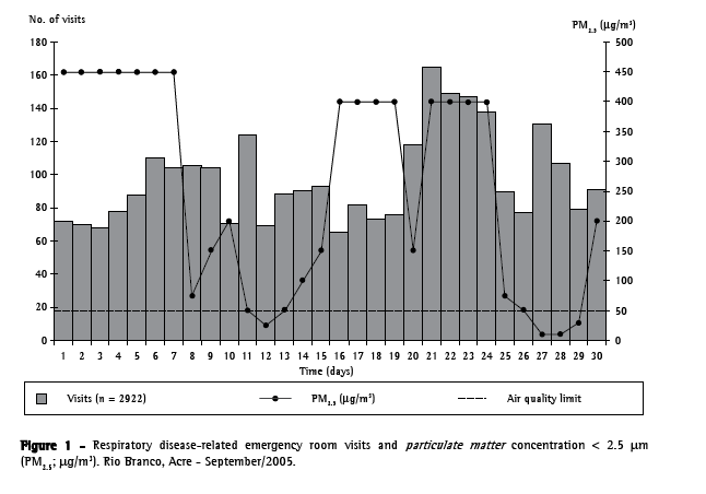 An ecological time series was carried out in order to evaluate the daily occurrence of emergency room visits due to respiratory diseases and their relation to air pollution. We evaluated all of the patients treated at the Hospital de Urgências e Emergências de Rio Branco (HUERB, Rio Branco Hospital for Urgencies and Emergencies) from September 1 to September 30 of 2005, including only those who had been diagnosed with respiratory disease under one of the following conditions: