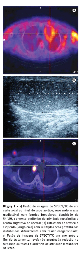 Paciente de 27 anos, do sexo masculino, não fumante, trabalhador da construção civil, sem histórico de câncer na família buscou tratamento em nosso hospital queixando-se de hemoptise intermitente com duração de dois meses (≈30-60 mL/24 h), perda de peso e dispneia (escala do Medical Research Council modificada, grau 2). Os resultados do exame físico, dos testes bioquímicos e dos estudos hematológicos foram normais. A radiografia de tórax realizada na admissão hospitalar revelou evidente alargamento do mediastino. Com base nesses achados, procedemos à quantificação dos marcadores tumorais séricos alfa-fetoproteína e gonadotrofina coriônica humana fração beta (Beta-hCG), obtendo os valores 2,59 ng/mL (valores de referência, 0,67-3,2 ng/mL) e 13,5 mUI/mL (valores de referência para homens, < 2,5 mUI/mL), respectivamente. A single photon emission CT (SPECT, TC por emissão de fóton único) e a TC convencional revelaram uma massa irregular (aproximadamente 8 × 8 cm) no mediastino anterior, com densidade entre 40 e 54 UH (Figura 1a). A broncoscopia revelou mucosa brônquica edematosa, hiperemiada, com pontos hemorrágicos e traços de sangue nos segmentos basais bilaterais, embora não houvesse sangramento ativo. Não havia invasão da luz ou ulceração da parede brônquica. Foi realizada uma biópsia da massa mediastinal guiada por TC. O estudo histopatológico da amostra obtida por biópsia revelou necrose, fragmentos de células e grandes células pleomórficas, com citoplasma claro, núcleo com cromatina grosseira e nucléolos evidentes, com aparência de neoplasia. A coloração imuno-histoquímica foi positiva para as citoqueratinas AE1/AE3, o hormônio gonadotrófico coriônico e a alfa-fetoproteína, embora a resposta para a sinaptofisina e para o antígeno leucocitário, comum em células neoplásicas, tenha sido negativa. O diagnóstico anatomopatológico foi TCG seminomatoso, diagnóstico este reforçado pelos achados de alfa-proteína sérica normal e Beta-hCG sérica moderadamente elevada. Para avaliar a extensão do tumor, analisamos SPECT/TC da cavidade abdominal, da cavidade pélvica, do cérebro e do fígado, mas não identificamos nenhuma alteração. A MT foi identificada por meio de ultrassonografia (Figura 1b). Constatou-se que a vascularidade estava adequada em ambos os testículos. O paciente recebeu seis ciclos de quimioterapia com cisplatina, etoposide e bleomicina. Após o tratamento, houve resolução da hemoptise. Além disso, a fusão de imagens de SPECT/TC, obtida após o tratamento, revelou redução no tamanho da lesão e ausência de qualquer atividade metabólica dentro da lesão, o que foi novamente observado um ano após o fim do tratamento (Figura 1c).