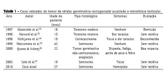 Recentemente, atendemos um paciente cujo diagnóstico foi tumor de células germinativas (TCG) seminomatoso associado a microlitíase testicular (MT). Até onde sabemos, há apenas seis casos publicados documentando a associação entre seminoma primário do mediastino e MT.(2-7) Outro aspecto que fez deste um caso excepcional foi o fato de o sintoma inicial ser hemoptise, uma característica relatada em menos de 1% dos casos de pacientes que apresentam TCG extragonadal com envolvimento do mediastino.(8)