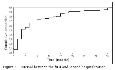 Internationally, various probability of re-admission within the twelve months immediately following the first hospitalization have been reported: 25.9%,(12) 26%,(19) 35%,(20) 43%,(11) and 47%.(17) Some studies have shown a tendency toward lower rates of multiple hospital admission after the use of prophylactic medication.(17,19) Others found no association between prophylaxis and lower indices of multiple hospital admission.(11,20)