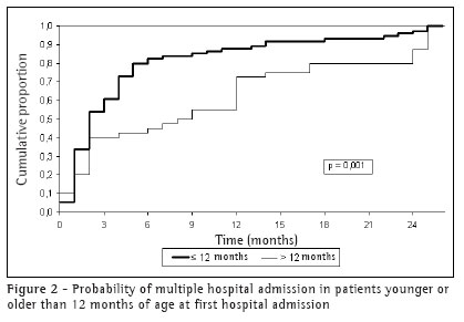 Cumulative probabilities of multiple admissions differed: three months after the first admission, 61% of the children twelve months of age had been re-admitted, compared with 40% of those older than twelve months of age (p = 0.001). In the group of patients first hospitalized prior to twelve months of age, 34% were re-admitted in less than one month.