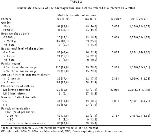Regarding the factors related to asthma, children who were diagnosed with persistent forms of moderate or severe asthma presented a risk of multiple admissions (OR = 6.28, 95% CI: 2.92-13.48) six times greater than did those diagnosed with mild or intermittent forms of asthma. The incidence of four or more exacerbations was also associated with multiple admissions (OR = 2.19, 95% CI: 1.03-4.71). Only 80 (39.6%) of the children were able to perform the functional tests. Forced expiratory volume in one second lower than 80% of the predicted value was not associated with multiple admissions.