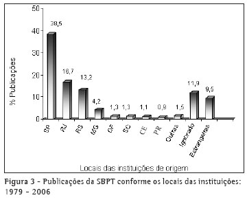 Assim como foi observado por Fabro, Yoo e Queluz, em relação aos resumos de congressos, a Região Sudeste destaca-se pelo maior número de publicações científicas na área da Pneumologia. Cabe ressaltar que os quatro primeiros Estados no ranking da produção de artigos científicos, São Paulo (38,5%), Rio de Janeiro (16,7%), Rio Grande do Sul (13,2%) e Minas Gerais (4,2%), também são os com o maior percentual de sócios dentro da SBPT. Nota-se, contudo, que o percentual de sócios da SBPT das unidades de Minas Gerais e do Rio Grande do Sul é quase o mesmo: 10% e 9,6%, respectivamente (Figura 3).