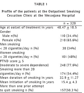 In order to characterize the profile of the outpatients, the following variables were assessed: gender; age at which the smoking habit was taken up; duration of the smoking habit; number of cigarettes smoked by gender; number of previous attempts to quit smoking; age at the initiation of treatment; and FTND score.