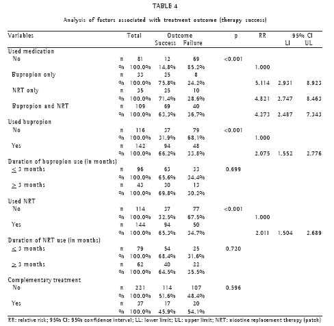 extended until three months in 65.5% of the cases and NRT in 68.4% of the time. Treatment failure was significantly associated with the non-use of medication (p < 0.001), whether bupropion (61.2%) or the nicotine patch (60.5%).