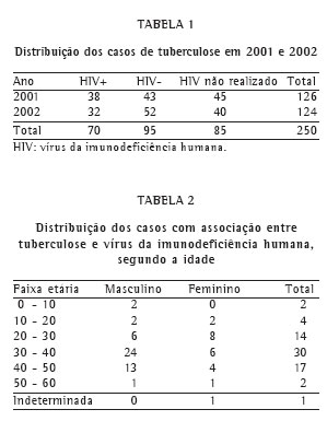 Nos dois anos de estudo, foram notificados 250 casos de TB, sendo que 169 ocorreram em indivíduos do gênero masculino. A associação entre TB e HIV ocorreu em 70 dos 165 casos em que se realizou o teste anti-HIV (42,4%) (Tabela 1). É importante ressaltar que 85 pacientes não realizaram esse teste (34%).