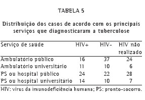 O diagnóstico da TB foi realizado principalmente nos serviços públicos, que foram responsáveis por mais de 80% dos diagnósticos de todos os casos de TB de Taubaté, sendo o principal serviço o pronto-socorro ou hospital público. Na Tabela 5 encontram-se os principais serviços que fizeram o diagnóstico da TB, que correspondem a 83,6% dos casos.
