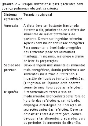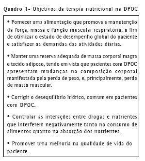 Uma nutrição adequada em termos quantitativos e qualitativos é de fundamental importância no tratamento da DPOC. No Quadro 1 são sintetizados os principais objetivos da terapia nutricional na DPOC.