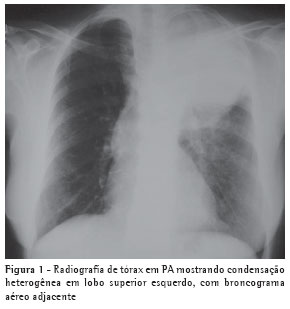 RELATO DO CASOUma mulher, de 69 anos, dona de casa, procedente de Montes Claros (MG), foi admitida no Hospital Universitário Clemente de Faria com quadro clínico iniciado havia 30 dias. Apresentava febre sem horário definido, calafrios, astenia, prostração, tosse oligoprodutiva com secreção mucoamarelada e perda de 7 kg nesse período. Teve episódios de hemoptóicos e dor torácica ventilatório-dependente, mais acentuada nas regiões infraclavicular e escapular esquerdas. Fez uso de antibióticos (amoxacilina, penicilina procaína e ceftriaxona) sem melhora do quadro.