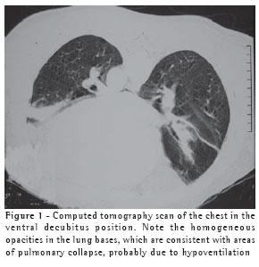 The imaging tests did not add much information, except for showing the reduced volume in the lung bases, which can be observed in the X-ray and computed tomography of the chest (Figure 1). When the patient changes the decubitus position (from supine to prone), the hypoventilated area is also altered, which shows that these areas of hypoventilation are perfectly expandable.