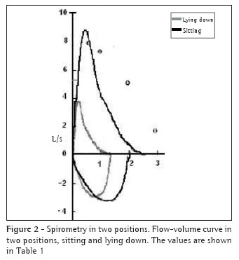 The spirometry was carried out in two positions (sitting and lying down), and the results are presented in Table 1 and Figure 2.