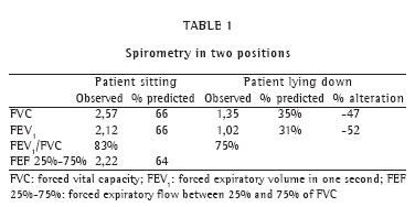 What called attention in the clinical profile of the patient was the immediate worsening of dyspnea upon reclining, as well as the practically instantaneous improvement upon standing. This indicated that the supine position, in which the abdominal viscera push the diaphragm upwards, thereby hindering its contraction and reducing its effectiveness, triggered the worsening of the symptomatology.