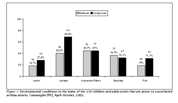 Results: Among the 210 asthmatic children and adolescents evaluated in 2001, adequate home environmental control was observed in 141 (67.1%), and no correlation was observed between the degree of environmental control and fewer (< 3) asthma attacks (p = 0.39). Regarding the rooms where the asthmatic patients sleep, inappropriate furnishings were found in the homes of 93 patients (44.3%), including rag curtains in 84 cases (40.2%). Passive smoking was reported in 77 cases (36.7%).