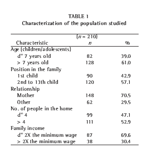 ResultsTable 1 shows the characteristics of the population studied. Of the 210 children evaluated, 128 (61%) were over the age of 7, and 90 (42.9%) were the first-born child. Among the interviewees, 148 (70.5%) were the mothers. We observed that 111 (52.9%) of the homes studied housed more than 4 people, and that, in 87 (69.6%) of these homes, the family income was lower than 2 times the official minimum wage.