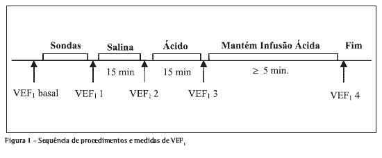 O estudo consistiu de espirometrias antes e após cada um dos procedimentos a seguir: introdução das sondas esofágicas (de manometria, de pHmetria e sonda nasogástrica de calibre 8F); infusão esofágica de solução salina normal (pH 5,5 a 6,0), com gotejamento de 10 a 20 microgotas/min durante 15 minutos; e infusão de ácido clorídrico (HCl) 0,1N (pH 1,0 a 1,5) com o mesmo gotejamento e duração. As soluções citadas eram infundidas através da sonda intranasal 8F localizada no ponto médio entre o esfíncter esofágico superior e o inferior, previamente definido através de manometria esofágica. Após os quinze minutos iniciais de acidificação esofágica, novas medidas de espirometria, a cada cinco minutos, foram realizadas até que o VEF1 se mantivesse estável (variação < 5%) e, assim, o protocolo era finalizado. Durante todos os procedimentos, o pH esofágico proximal e o distal foram monitorizados através do sistema de pHmetria. Todas as espirometrias foram realizadas no laboratório de provas de função pulmonar da Divisão de Pneumologia da Faculdade de Medicina de Ribeirão Preto da Universidade de São Paulo, no período da manhã, usando um mesmo aparelho, pelo mesmo profissional, tecnicamente capacitado. O resumo esquemático do protocolo está ilustrado na Figura 1.